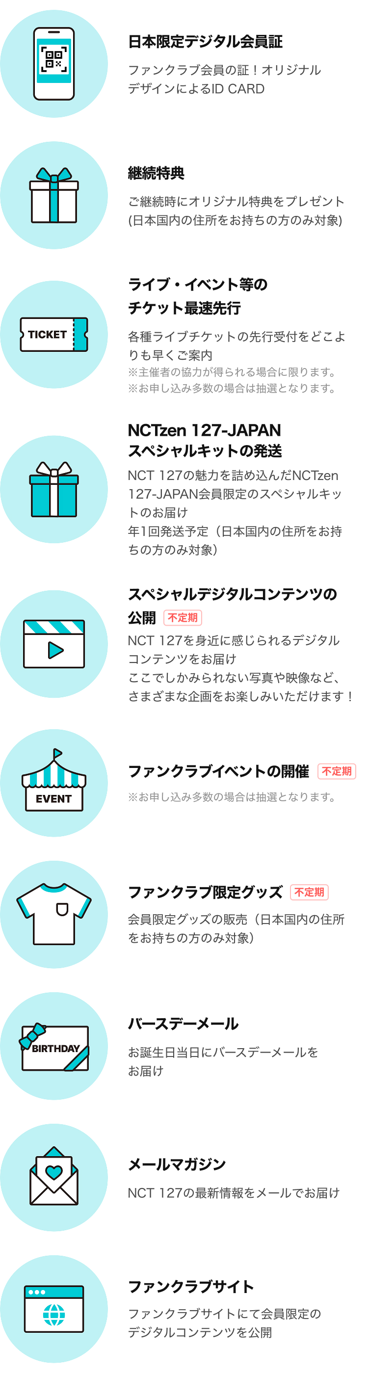 ※ 本ページに記載の特典は「NCTzen 127-JAPAN」 Membership (JP)をご購入いただいた場合に限ります。NCTzen 127 Membership (GLOBAL)をご購入された場合、特典内容が異なりますのでご注意ください。