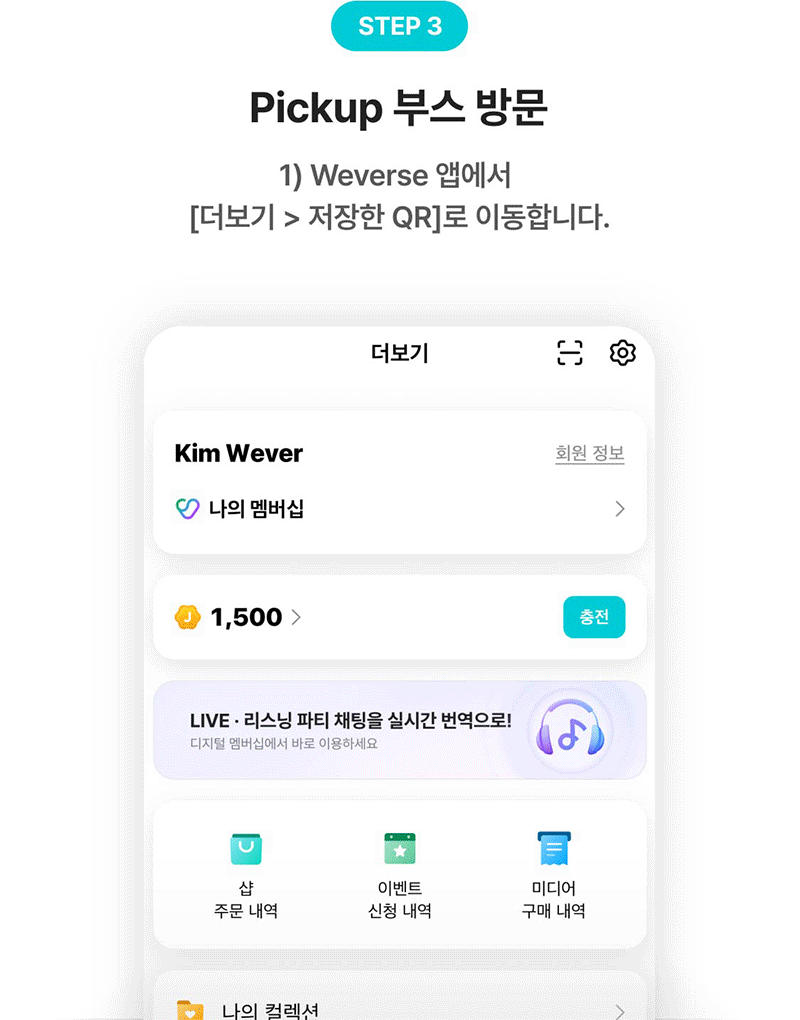 Weverse 앱 > 더보기 > 저장한 QR 메뉴에서