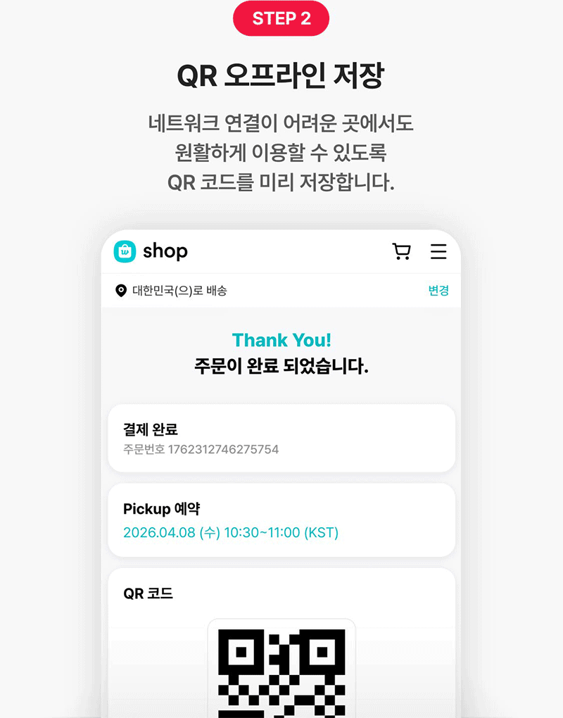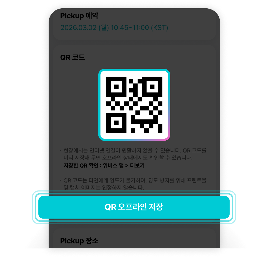 Pickup 예약 후, QR 코드를 오프라인으로 저장해 두세요.