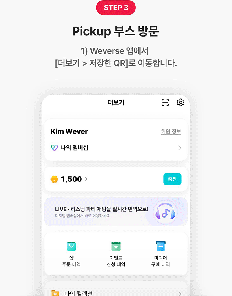 Weverse 앱 > 더보기 > 저장한 QR 메뉴에서