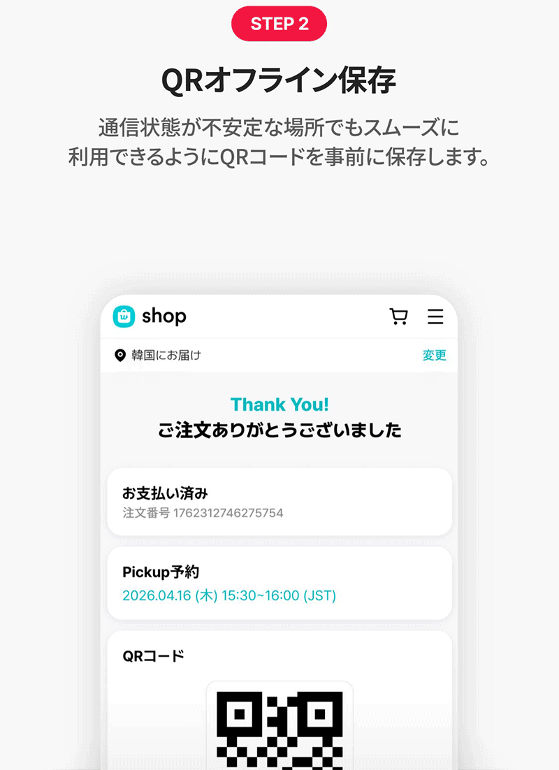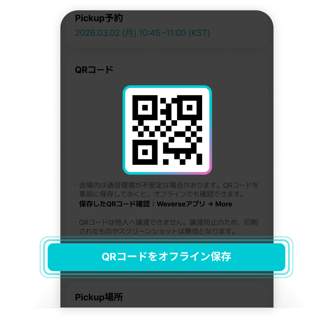 Pickup予約後、QRコードをオフライン保存してください。