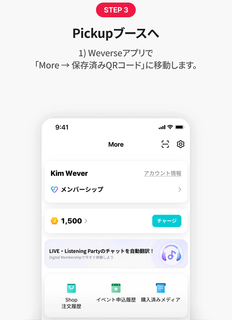 「Weverseアプリ → More → 保存済みQRコード」