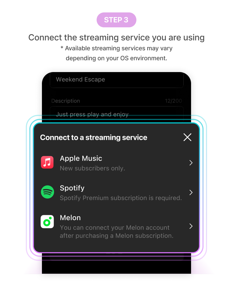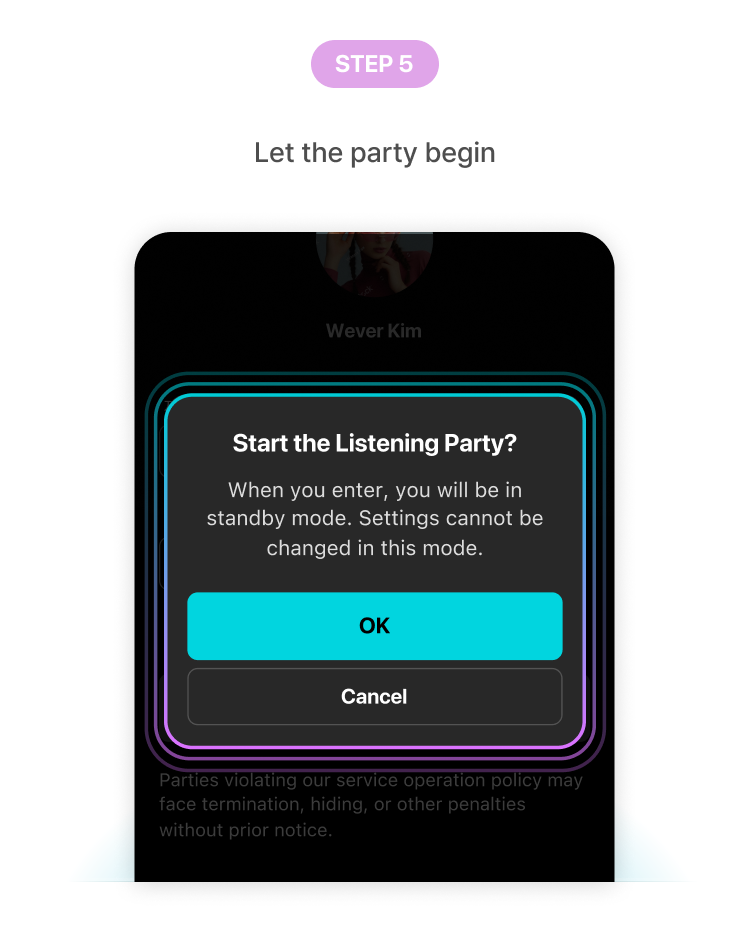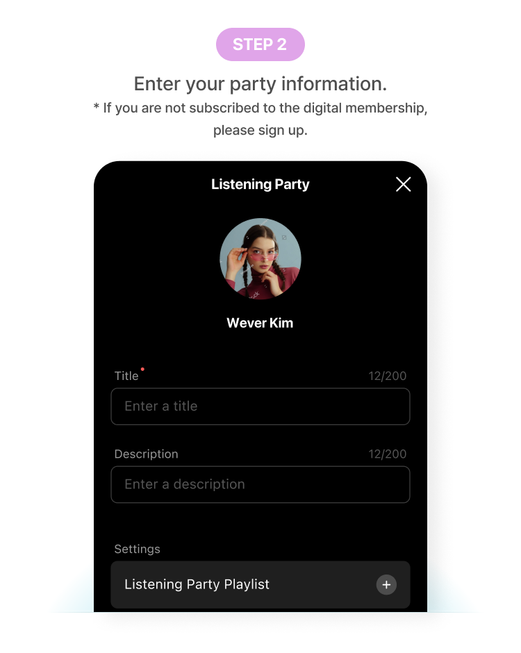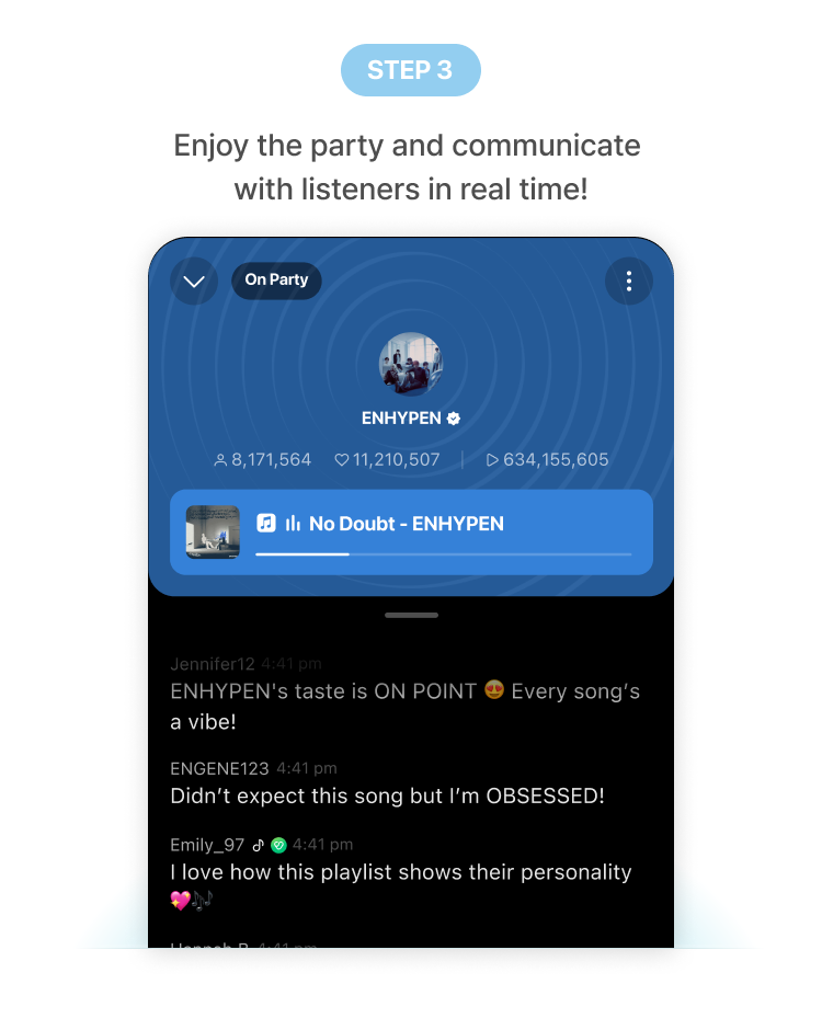 Listening Party is a service on Weverse that connects with music platforms, allowing you to listen to music together and communicate in real-time.